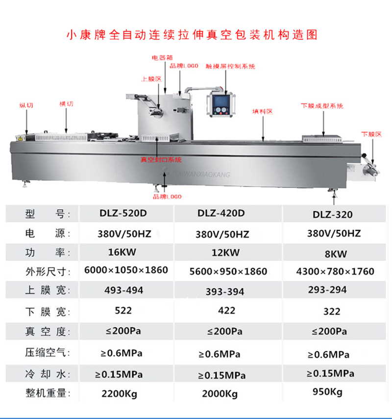 連續(xù)拉伸真空包裝機上下膜均采用片膜,上膜使用復(fù)合膜,下膜使用拉伸膜材,下膜通過鏈條的夾緊帶動下進入成型模具,在成型模具里邊通過加溫和氣壓成型,使之將下膜拉伸出需要的凹槽形狀,在擺料區(qū)將要包裝的產(chǎn)品放入已經(jīng)拉伸成型的下膜盒里,隨著鏈條的向前運行進入到封口模具里,在封口模具里將上膜附在下膜上,先抽真空再充氣再封口(將上下膜封在一起)。最后排氣,降模,包裝好的產(chǎn)品繼續(xù)向前運行,先通過移動噴碼系統(tǒng)將每個產(chǎn)品噴印生產(chǎn)日期。在橫切區(qū)將產(chǎn)品橫向切為單排,最后由縱切裝置將產(chǎn)品縱向切開,使每個產(chǎn)品都獨立成型。設(shè)備還附加了光標(biāo)跟蹤對齊彩膜系統(tǒng),為用戶節(jié)約成本。為用戶配置廢棄邊料回收吸料筒系統(tǒng),保持環(huán)境衛(wèi)生。